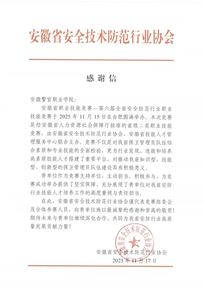 安徽省職業技能競賽——第六屆全省安全防范行業職業技能競賽于2025年11月15日在我院成功舉辦,我院作為競賽支持單位,精心調配優質資源,全力搭建良好平臺,圓滿完成工作任務。近日,我院收到安徽省安全技術防范行業協會寄來的感謝信。